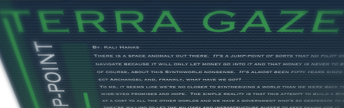 Da draußen gibt es eine Raumanomalie. Es ist eine Art Sprungpunkt, durch den kein Pilot oder Schiff hindurch navigieren kann. Denn es lässt nur Geld durch sich hindurch, und Geld, was einmal in diesem Sprungpunkt verschwindet, wird nie wieder gesehen. Ich rede natürlich von diesem Synthworld-Blödsinn. Es ist bald 50 Jahre her, dass sie Projekt Archangel angekündigt haben und, offen gesagt, was haben wir davon?